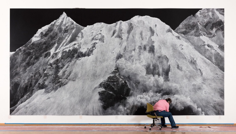 The drawing of a tree and its roots for example really stands out and the use of a blue biro to create the effects works really well. Similarly the cloud studies on black paper .You may have been inspired by Tacita Dean’s black and white drawings of mountains. They were on display in London recently but just in case you didn’t see them I’ve illustrated one here.