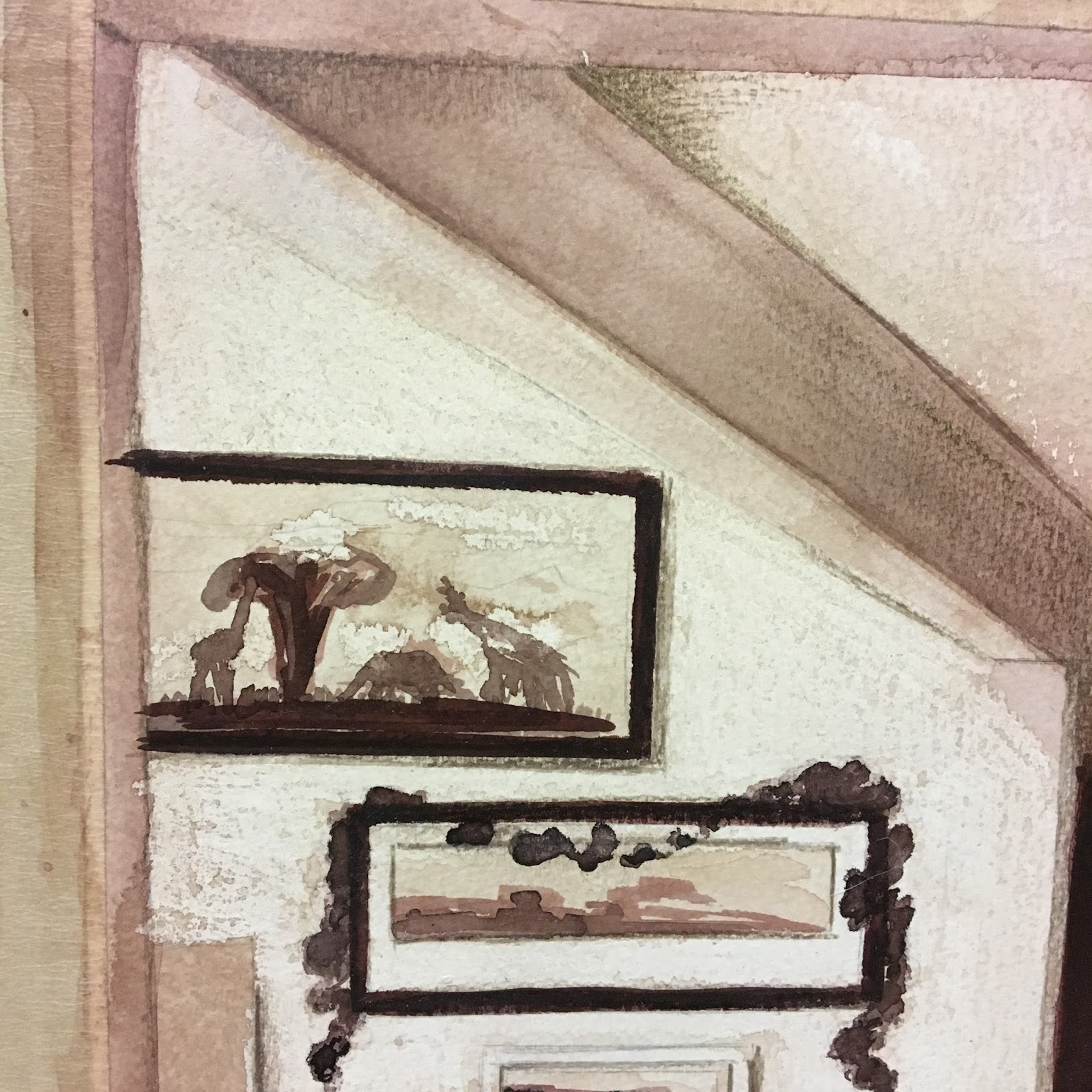 The coloured vase takes me back to my childhood; I remember it sitting in the hallway of my grandparent’s house. It was a gift from my Great Grandad to my Great Nanny. It gives me a feeling of place, a grounding, a sense of belonging in a loving environment. Words I feel when I take myself back – happy, content, fun, cosy, interesting, creative, flowing. The gesture and marks need to be as flowing and free, and so brush and ink allowed me this movement.