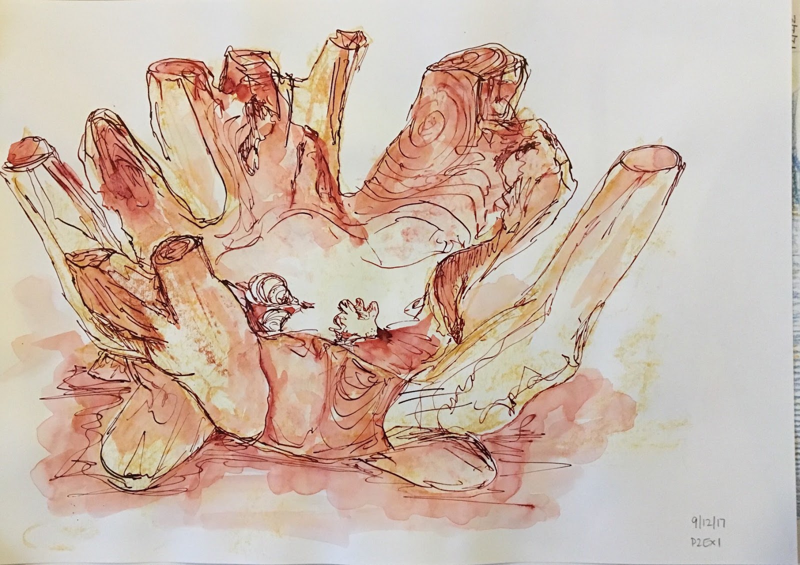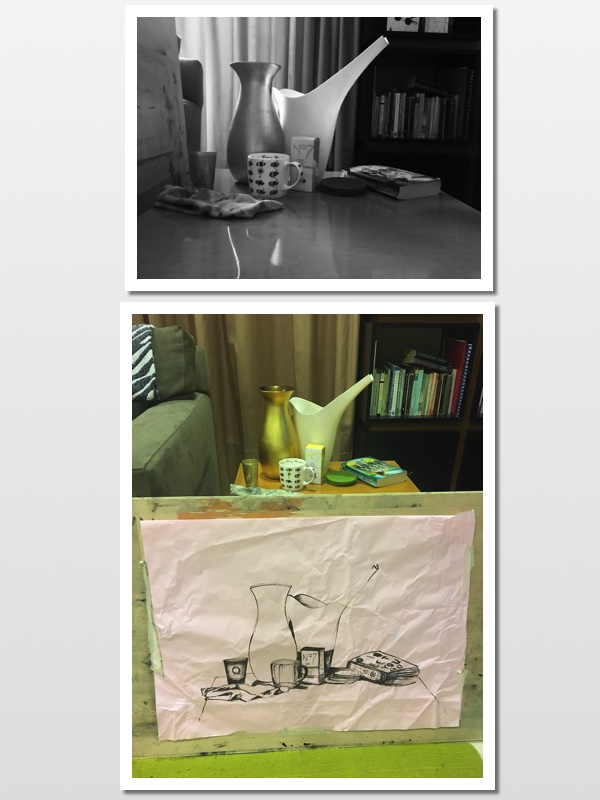 Below are photos from the process, plus the earlier composition ideas I had. I started with a black ink wash, with the cloud area tissued away. Ink does not seem to react to this as well as black watercolour may have done as I was looking for more of the delicate cloud edges to appear from the tissue. Nice enough though.