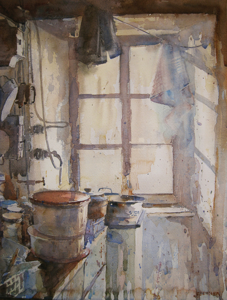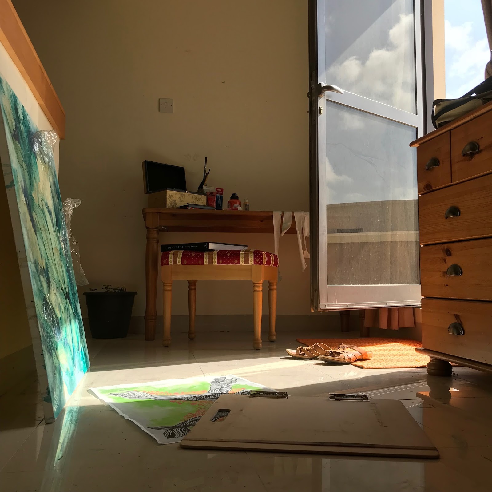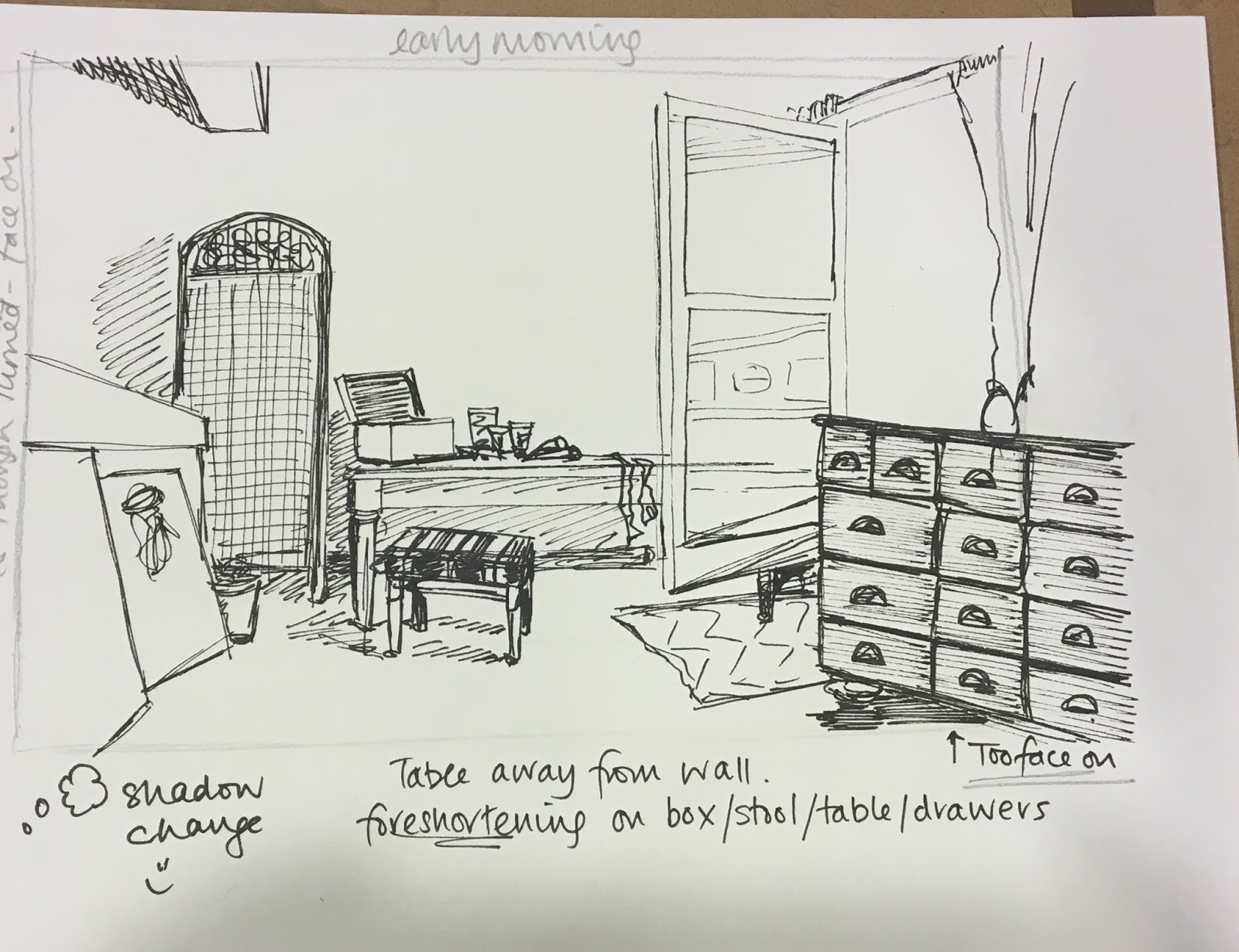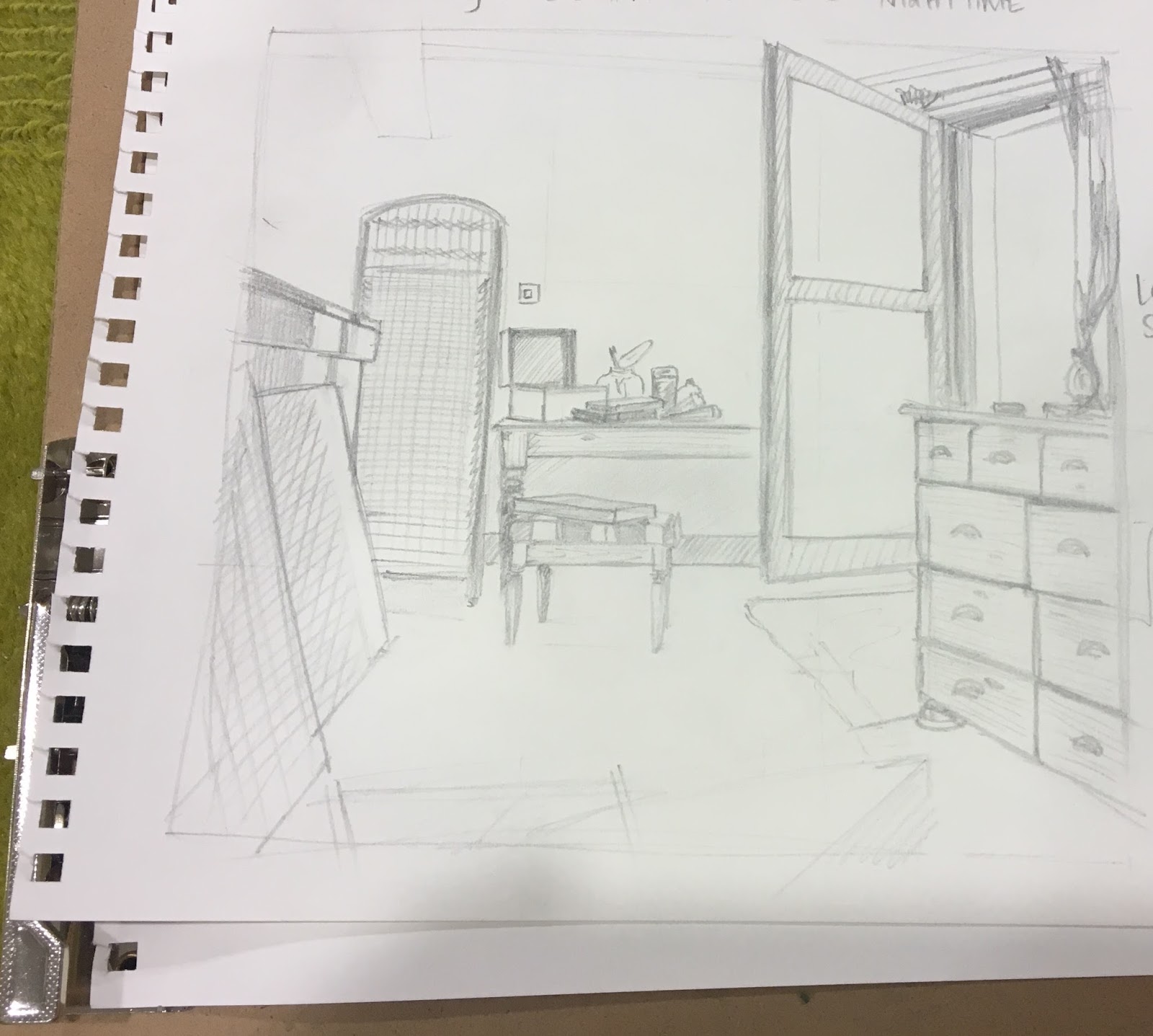 I have had no shortage of places to draw in the house. I had in mind I would draw my art ‘room’ at the top of the house as it is my bolt hole and a place to relax that nobody else visits. I found some beautiful light play and reflection at different times of the day and I was excited that this could make a good composition and assignment.
