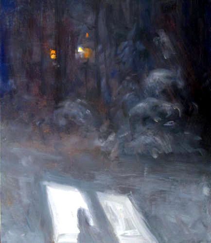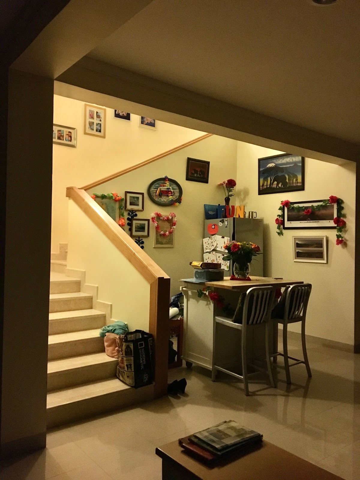 It is very peaceful, but almost eerie. Not a soul except me awake. The landing light being left on to guide me upstairs. Shadows and reflections being cast on the tile floor. What is where the light is? What does it lead to?